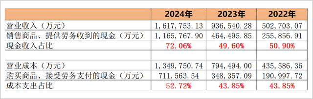 然而,分析报告期内的现金收入比和成本支出比不难发现,2024年这两项都出现了明显的异动。现金收入比从前两年的50%左右跃升到72%,而对应的成本支出比也从43%左右增长至53%,二者之间虽然同涨,但是涨幅存在差异,由此造成了大规模的现金净流入。
