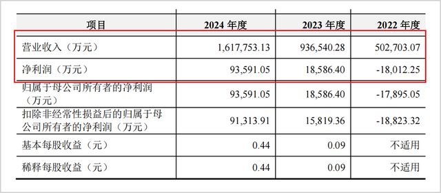不俗的市场份额也匹配着高速增长的账面营收。2022-2024年底(简称报告期),汇川联合动力的营收分别为50.27亿元、93.65亿元和161.78亿元,年复合增长率高达79.4%,而同期净利润分别为-1.80亿元、1.86亿元及9.36亿元,2024年净利润增幅更是达到了403.2%。