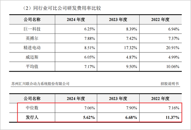 报告期内,汇川联合动力的研发投入呈现“规模增长但占比萎缩”的背离特征,研发费用率从2021年的11.37%下滑至2024年的5.62%,累计降幅超过50%。尽管2024年研发费用绝对值增至9亿元,但相较于年复合79.39%的营收增速,其研发强度反而大幅缩水,同时研发费用率也低于行业平均。